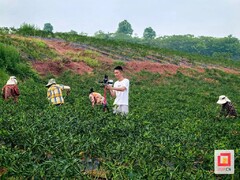 凌晨五点,天刚蒙蒙亮,龙潭镇团山村党支部书记林兵已经忙活开了。他站在一片挂满果实的辣椒地里,举着手机,对着镜头,声音带着刚起的沙哑但挺有劲:“家人们看,这是咱龙潭镇新鲜的小米辣,颜色正,辣味足!” 手机支架立在田埂边,林兵不时调整镜头,补光灯照亮五六个正弯腰采摘的村民,手指一掐一掰,熟透的小米辣落入筐中。对着村民沾泥的手和满筐的小米辣,林兵继续给网友介绍:“大家看看这辣椒,用的都是有机肥,凌