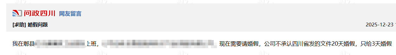 红星新闻“公司不承认省里文件,婚假只给3天!” “私企说没看到红头文件,就是不执行。” “我们事业单位也说没接到上级通知,不让休20天婚假。” …… 11月26日,我省延长婚假至20天的新规甫一出台,便收获无数期待。然而,一个月过去,记者发现,在“问政四川”平台上,有关婚假申请被拒的咨询与投诉却接踵而至。 政策“热发布”遭遇一些企业“冷执行”,这道婚育支持政策的落地“梗阻”究竟卡在哪里?又该如何疏通?