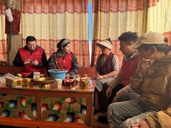 新都区融媒中心邓兴(左)和泽仁正呷(左二)、林竹(右二)走访群众。 高原的风裹挟着赤诚,驻村的路承载着担当。2024年7月,由甘孜职业学院派驻的“资源枢纽”第一书记林竹、四川省文旅厅派驻的“技术尖兵”邓兴、理塘县高城镇本土“双语桥梁”泽仁正呷组成的3人驻村工作队,肩负组织重托进驻理塘县高城镇更登亚批社区——这个2021年落成、承载1461户5298名搬迁群众幸福生活的“高原新家”。三人各亮专长、优势互补