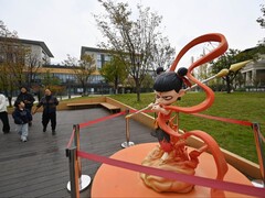 新华社今年春节档上映的动画电影《哪吒2》中,殷夫人消散、哪吒撕裂与重生、天元鼎壁燃烧等特效镜头让众多观众倍感震撼。 这些充满张力又饱含细节的画面,出自墨境天合成都数字图像科技有限公司。在墨境天合所在的成都天府长岛数字文创园,记者了解到,《哪吒2》制作链上的许多企业都在此集聚:可可豆动画负责出品制作,千鸟动画承担美术设计…… 11月2日,市民从成都天府长岛数字文创园的哪吒形象雕塑旁走过。新华社记者肖潇