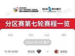 2025/2026四川银行四川省城市足球联赛(简称“川超”)分区赛第六轮将于11月1日开踢!本轮的9场对决将分别于11月1日(4场)和2日(5场)两个比赛日进行,为了方便各位球迷朋友观赛,观观整理了比赛日程,请查收! 随着自贡队逆转宜宾队,坐稳川南赛区榜首,精彩的“川超”分区赛第六轮也告一段落。本周末,第七轮也将随之打响,出线名额之争愈发激烈。 川东赛区:成都锦城队本轮将回到主场迎战排名第二的达
