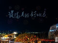 川观新闻您的浏览器不支持 video 标签。 “国泰民安具象化了,愿每个中国人都越来越好!” 3月1日晚8点,资阳城区苌弘广场,漫天焰火映红了28岁市民李睿的脸。他的脸上透着兴奋,也透着感动。这位特意从成都赶回的青年,在沱江边见证了家乡从未有过的沸腾。 无人机组成的“资阳是个好地方”字样。全媒体记者 张建 摄 当日,资阳“元宵”民俗巡游与无人机焰火秀如期上演。从下午到夜晚,从地面到苍穹,民俗巡游、