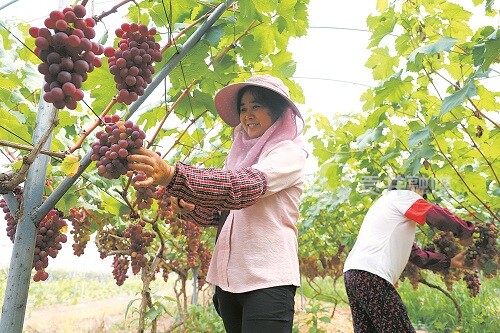 8月24日中午,骄阳似火。位于中坝村幸福园现代农业有限公司100亩的葡萄园里,一串串色泽诱人、晶莹剔透的葡萄挂满枝头,吸引了不少客商上门进货。