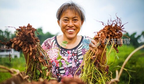 桥头镇杨可琴手捧刚挖出来的花生喜上眉梢