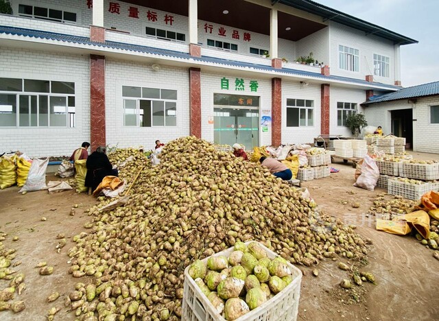 同样在距离“谭八爷”不远的成佳镇,一个叫“自然香”大头菜的加工厂,2019年实现了网络交易额约100万元。“我们确信今年的成佳大头菜也是一如既往的好品质,今年早就吸引了来自宜宾、乐山、泸州甚至外省的客商们来和本地加工厂‘抢菜’”。成佳镇大头菜专业合作社社长,也是镇上大头菜“龙头企业”自然香大头菜加工厂总经理王信宽站在成佳镇大头菜标准化示范区,看着地里茁壮生长的大头菜说道。