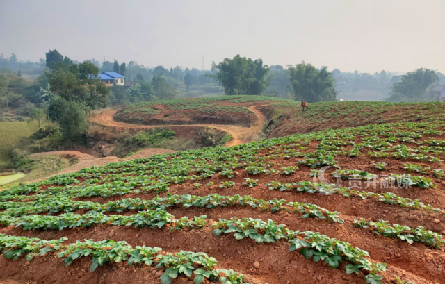 今年,照石村完成道路整改2.6公里,从过去狭窄的碎石沙土路变成了现在4.5米宽的水泥路。村里以此为契机积极发展集体经济,与省级专合社自贡市宝绿土豆专业合作社联合在当地流转土地200亩,进行花生、马铃薯、生姜、蔬菜等循环种植。有包括贫困户在内的20多个村民在基地长期务工。