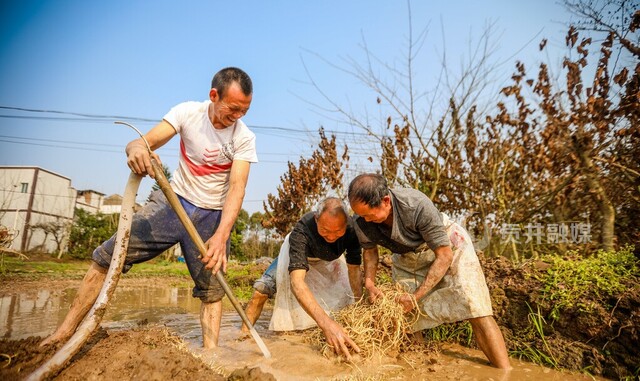2月23日,贡井区龙潭镇中坝村6组,村民冯建在另外两位村民配合下,正在用高压水枪“挖”折耳根。