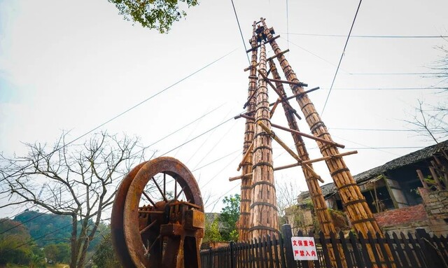 为保护传承盐都井盐手工业文明,自贡市于去年10月29日至今年1月29日,采用传统工艺,在贡井区艾叶镇大码头社区4组永胜路73号天福井原址之上,复建了一座高18.1米的四脚天车。