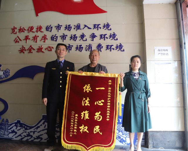 “感谢你们为我追回了我的养老钱,请你务必收下这面锦旗”,这是2022年4月22日早晨发生在自贡市贡井区市场监管局党员维权岗前的一幕。一名年迈的老人一手拿着印有“一心为民、依法维权”的锦旗,一手拉着维权工作人员的手,连连感谢市场监管局的维权。