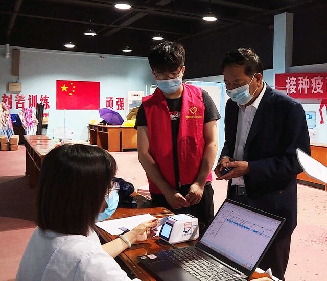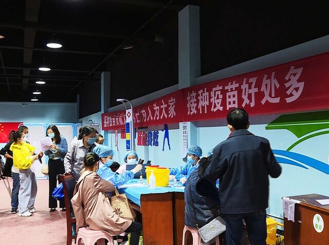 接种现场合理划分出了预检登记区、接种区和留观区等多个区域,前来接种疫苗的居民正在有序地排队。接种前,医务人员仔细询问每位居民的病史、身体状况等信息,确认条件符合后,再为居民接种疫苗。现场还有不少志愿者在负责秩序维护、答疑解惑等服务,确保整个接种流程规范有序。