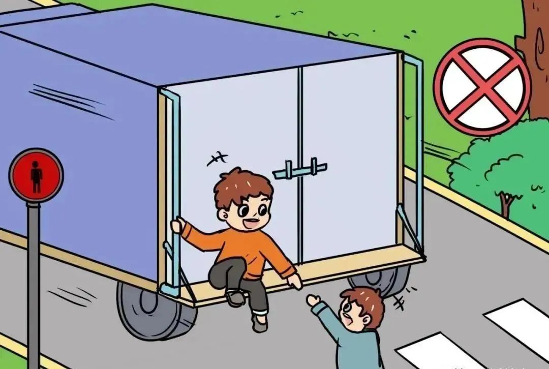 不要因为好玩,就去追赶行驶中的车辆,要是撞上行人、电线杆或电话亭等物体,会伤的不轻。另外,汽车在高速行驶时,撞上飞来的物体,冲击力非常大,往往会造成非常可怕的后果。