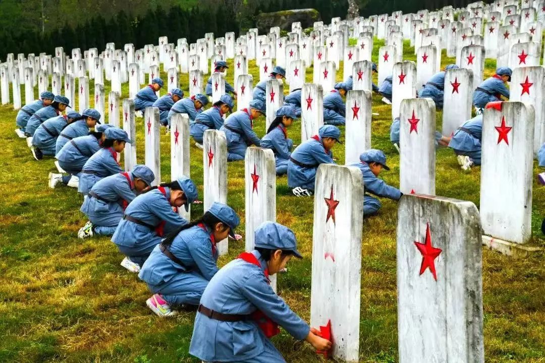 少先队员们用毛笔蘸上油漆,一点一点地把褪色的五角星重新描红。白色的墓碑在山坡上整齐排列,五角星重现了红色的光泽。队员们通过这种方式缅怀先烈、致敬英雄。