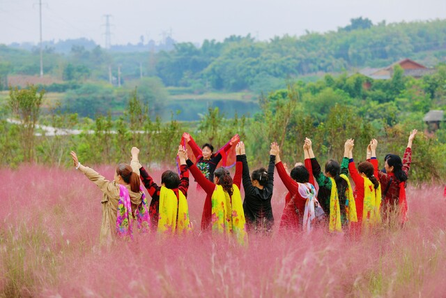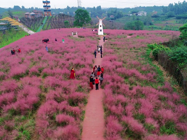 贡井区五彩荷园成片粉黛乱子草进入盛花期