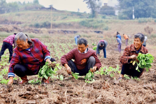 10月24日清晨,在贡井区成佳镇徐家村大头菜产业园区内,村党支部书记饶桂兰和村民们一起挖土、打窝、移栽。