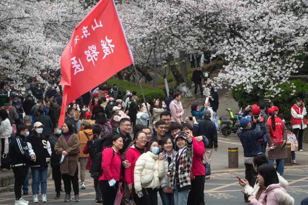 资料图:山东省日照市援鄂医疗队员在武汉大学校园樱花树下合影。新华社记者 肖艺九 摄