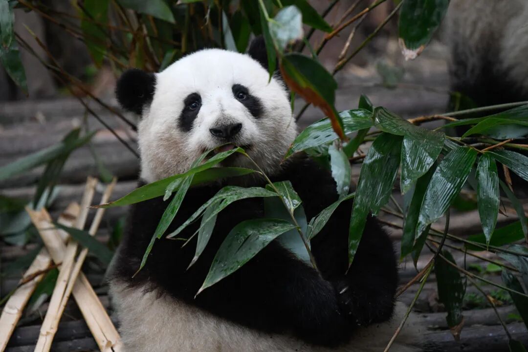 资料图:在成都大熊猫繁育研究基地,大熊猫“和花”在吃竹子。新华社记者 胥冰洁 摄