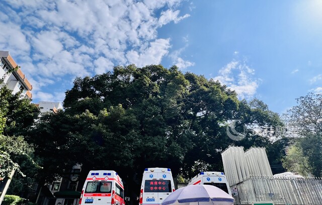 在自贡市第三人民医院行政楼门口,一棵参天黄葛树的枝丫间泛出新绿,迎上东方的第一缕晨光。走到树下,如同被一把巨伞笼罩,抬头看也难以窥得古树全貌,要往后退许多步,才能将其尽收眼底。这棵树是贡井年龄较大的古树,根据测算,约有223年。