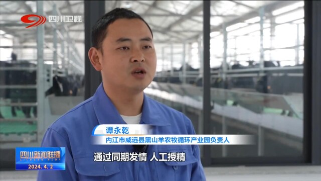 内江市威远县黑山羊农牧循环产业园负责人 谭永乾:通过同期发情、人工授精和加强饲料营养供给等技术,让母羊每胎产3-4只羔羊,这样既能够有效缩短繁殖周期、提高繁殖率,还能够使养羊经济效益明显提高。
