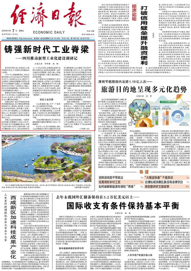 4月7日出版的《经济日报》在头版头条以《铸强新时代工业脊梁——四川推动新型工业化建设调研记》为题,报道了四川加快构建富有四川特色和优势的现代化产业体系,坚决挺起经济大省的工业“硬脊梁”。