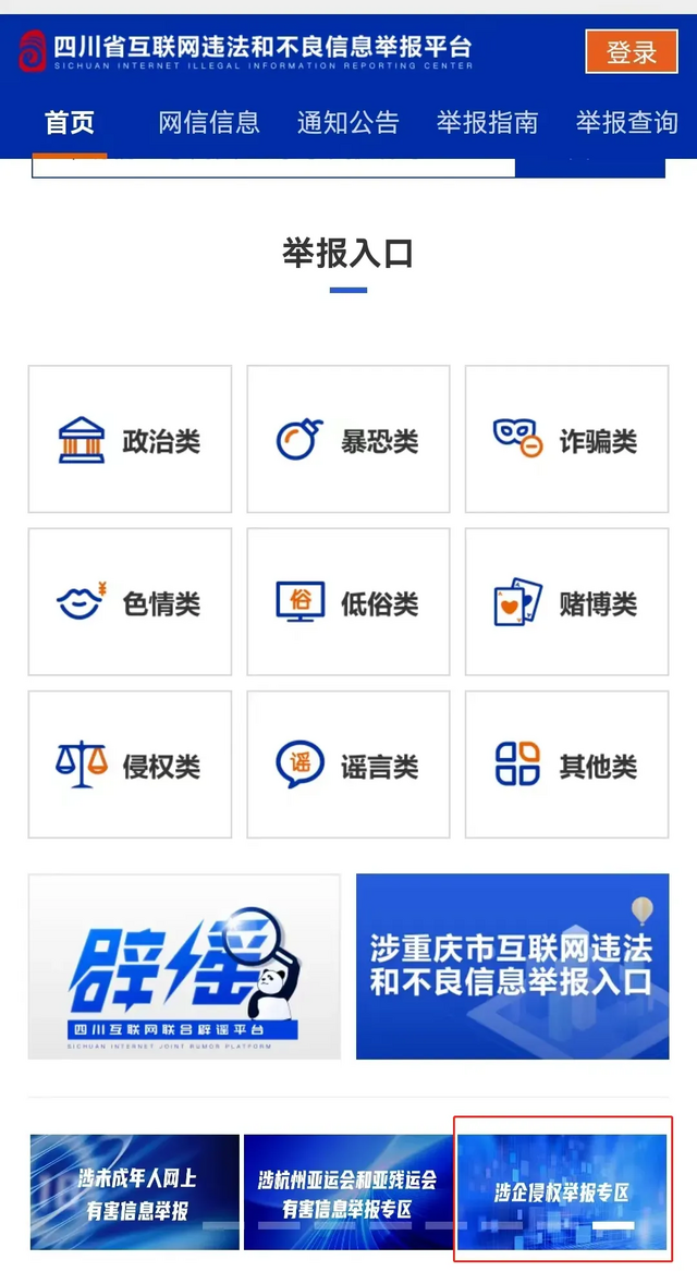 ①登录四川省互联网违法和不良信息举报平台(https://www.scjb.gov.cn/),通过首页“涉企侵权举报专区”或在“举报入口”点击对应专区进行举报。