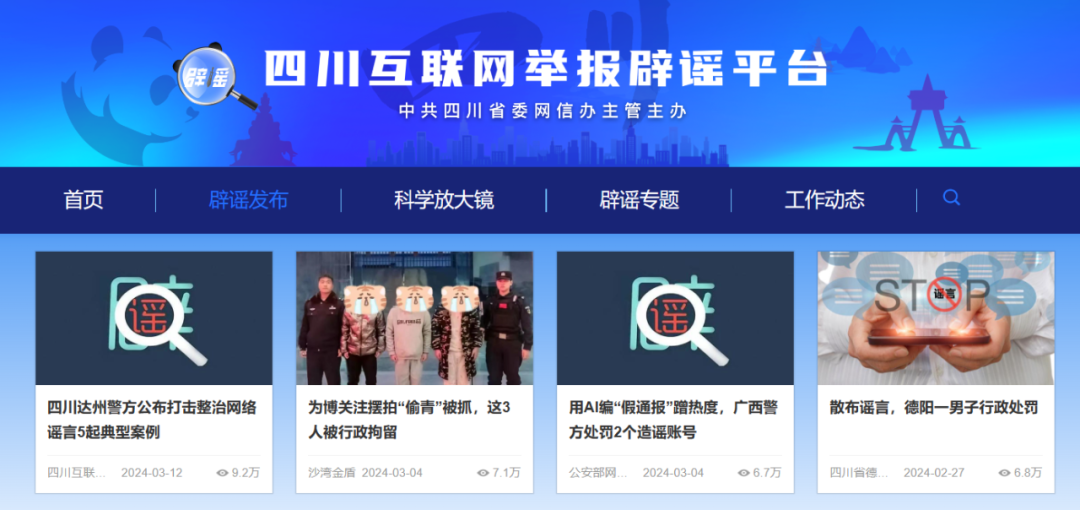 如,机制创新。四川创新“1+5+N” 网络辟谣联动机制,建强四川互联网举报辟谣平台“树干”,壮大5家粉丝总量过亿的省内重点媒体“树枝”,发挥40家省直部门政务新媒体、21个市(州)网信辟谣平台和新闻网站、185个县级融媒体中心等“树叶”力量,最大限度放大权威辟谣声量。截至目前,仅平台端,已发布权威辟谣内容12000余条,原创辟谣稿件2000余条。其中,36条辟谣稿件阅读量过亿,阅读量100万+的稿件达130条,在全网发出了具有四川特色的“辟谣之声”。