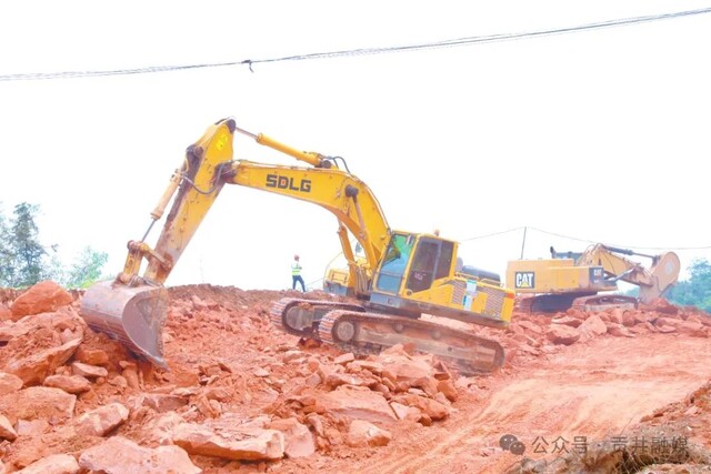 施工现场,只见数台运输车、渣土车、挖掘机、压路机等大型机械来回穿梭,施工人员正抢修新桥、文家湾桥,进行裁弯开山取直、土石方回填、路基碾压作业,现场一派热火朝天的景象。