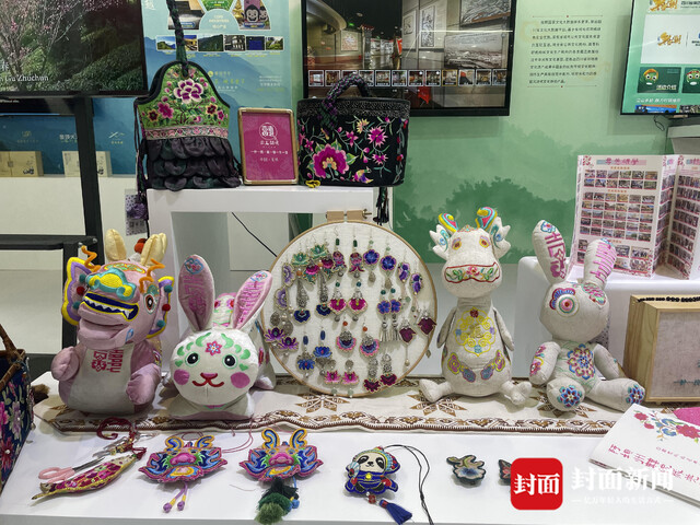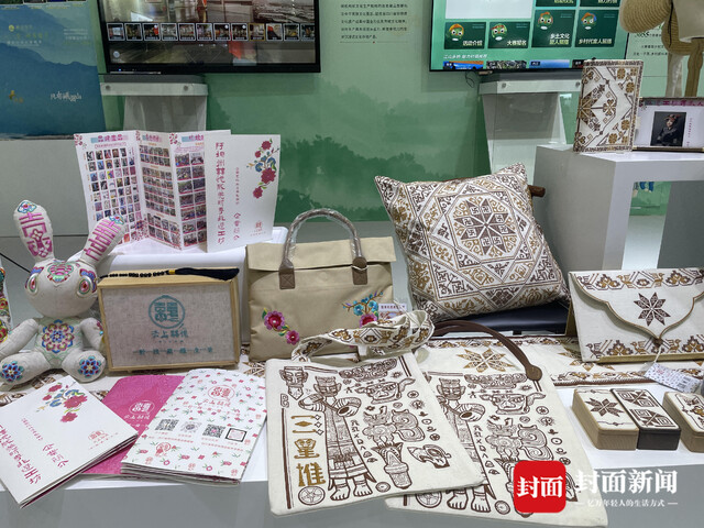 “可以看到,我们现场的产品都是各式各样的,有包包、玩偶,还有首饰、收纳盒等等。其中有的纹样,就是我们羌族妇女传统的围腰上的纹样,我再把这些纹样图案衍生出来,呈现在各种文创产品中。”