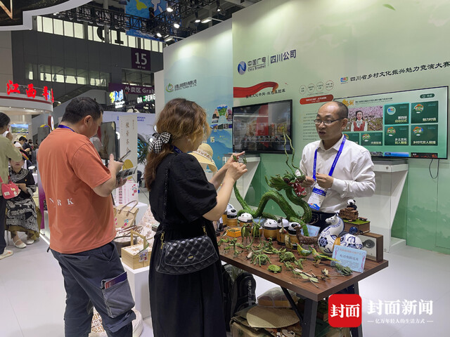 “其实,不管是草编还是竹编,它原来都是老百姓生活中的一部分,只是后来随着生活的变化,新材料、新技术的产生,传统的手工艺受到了冲击。”但现在,随着非遗传承人经过研究,结合现代人的生活和审美开发出来的文创产品,也让传统文化重新融入当下人们的生活中。“你看现场的文创产品,它都是很接地气,可以直接在生活中使用。比如这套与大熊猫元素结合的竹编茶具,还有茶叶罐等,就很受消费者的喜爱。”