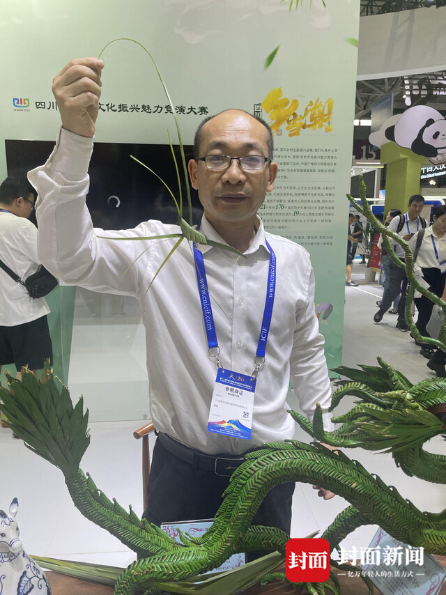 “此次亮相深圳文博会,有来自我们北川的两个非遗项目,一个是四川省级非物质文化遗产项目,叫做羌族草编;还有一个是北川竹编,现在是市级的非遗项目。”展馆中,北川羌族草编传承人黄强一边手中摆弄着棕榈树叶,一边向记者介绍他所展示的非遗项目。