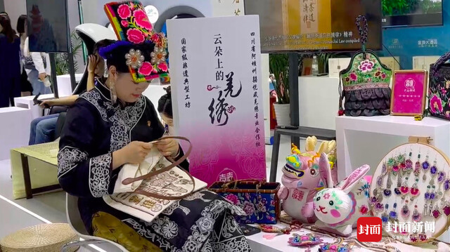 阿坝州羌族刺绣传承人张居悦在现场展示羌绣技艺