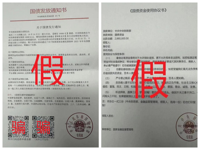详情:近日,有网民收到来历不明的快递,内有“国债发放通知书”“国债资金使用协议书”等文件,其中声称“本次国债通过人力资源部抽取部分人员采用文件书面通知民众”“中央财政发放近万亿国债,仅需28800元便有机会申请提款288万”。经核,此行为系骗子假借财政部发放国债之名实施的诈骗。若网民信以为真,通过通知书里的链接进入聊天界面,便会查到自己已在审核通过中。这时,对方会发送一个“重要通知”,声称通过审核后,想领取资金需要缴纳总额1%的手续费。随后,不断通过“开户行填写错误、密码错误导致账号冻结需要解冻”等为由,诱导网民转账,从而实施诈骗。