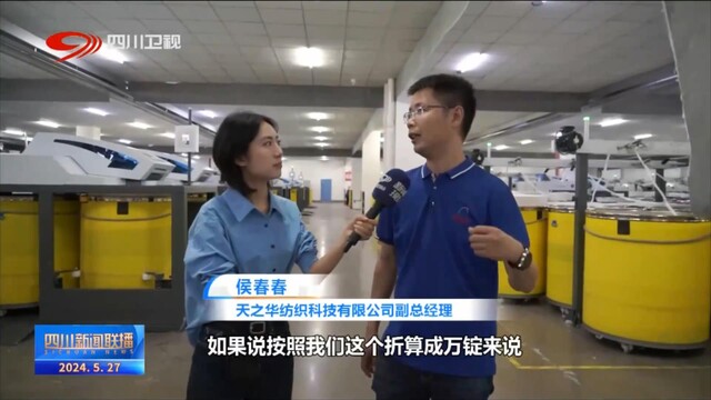 记者 陈琪璇:我现在是在宜宾天之华纺织科技有限公司的涡流纺车间,在我身后原料棉条正以每分钟550米的速度上下飞转,“变身”为一锭锭成品纱线,每天这个车间能够产出约36吨纱线。