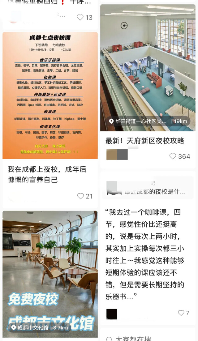 某平台数据显示,今年以来,四川“夜校”的搜索指数同比增长42%,咨询指数同比增长438%。成都市文化馆去年冬季特色课程上线时,夜间课程的400个名额眨眼间就没了;今年3月,文化馆推出的102个班名额再次被“秒杀”。大数据调查显示,在文化天府APP中,抢课开始后第一秒内,平台的点击迸发量可达到26万次/秒。于是市民们纷纷给文化馆的招生帖子留言,“已阅,快删,求你让我抢课成功!”“抢票之难,难于上青天。”