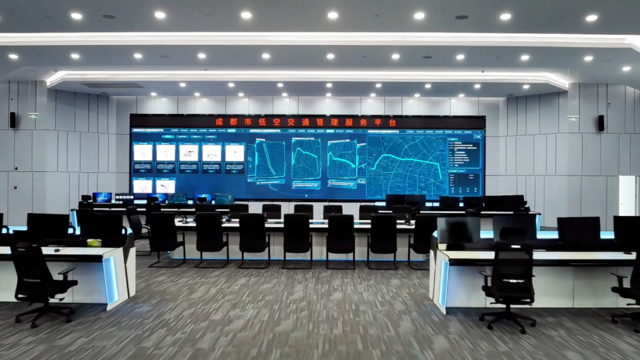 在成都低空飞行服务中心的大屏幕上,全市低空领域飞行状态一览无余,代表飞行器的标识在三维地图中按照既定航线移动,飞行高度、速度、经纬位置在屏幕上实时变动。工作人员用鼠标点击一下移动的图标,航班号、标识号、生产厂家信息就清晰地出现在屏幕上……
