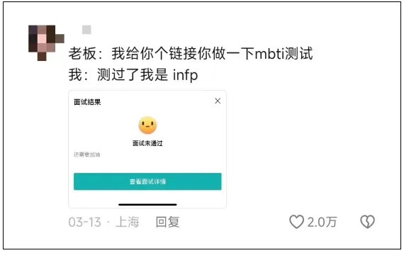 有人对MBTI痴迷并分享给身边朋友,也有人对MBTI的测试结果嗤之以鼻。但无论是将结果作为生活与工作的判断依据,还是仅仅作为一种娱乐方式,MBTI正在渗透进当代年轻人的社交,成为一种“扺掌相认”的暗号。