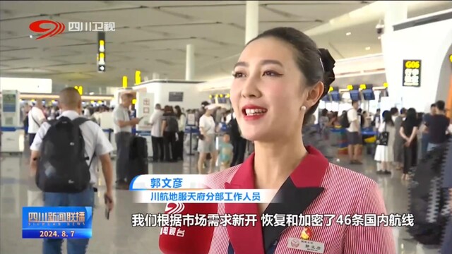川航地服天府分部工作人员 郭文彦:暑运期间,我们根据市场需求新开、恢复和加密了46条国内航线,包括成都至北京、库尔勒、伊宁、阿克苏等地,暑运第一个月,川航执行班次2.3万班,同比提升了80%以上。