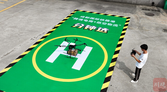 8月7日下午,位于成都国际铁路港综合保税区内的成都青铁国际贸易有限公司接到客户订单,在迅速完成拣货、打包以及海关审核清关后,工作人员将商品送上无人机,不到两分钟便送到亚蓉欧国家(商品)馆OTO跨境体验中心店的消费者手里。此次飞行,标志着全国首个“中欧班列+低空物流”配送模式落地成都国际铁路港。