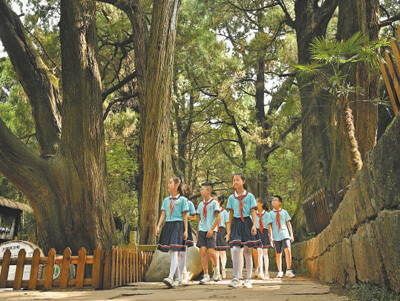 8月24日,广元翠云廊,学生在参观游览。翠云廊是古蜀道重要路段,拥有迄今保存最完好的古代人工栽植驿道古柏群。本报记者 雷 声摄