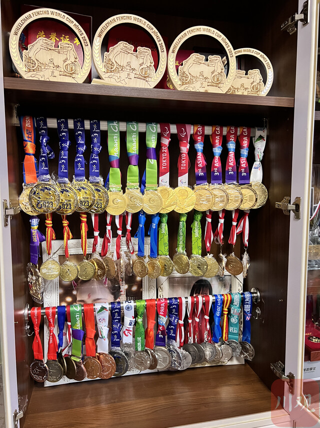 杨翠华夫妇也在家里定制了一面柜子,把女儿这些年来的奖牌都挂在里面,并用保鲜膜包裹起来。“这些奖牌都是靠她的刻苦努力拿回来的,我们父母虽然帮不上什么忙,但我们永远是她最坚实的后盾,永远为她感到自豪!”