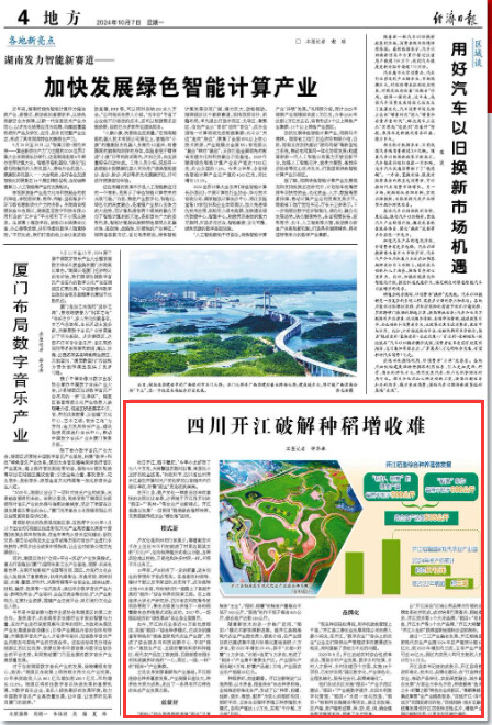 2023年8月,开江启动农村综合性改革试点,围绕乡村产业发展、数字乡村发展、乡村人才振兴、乡村治理四个方面,实施18个项目,已初步实现“园区数字化、产业绿色化、全程机械化、服务社会化、品牌高端化”。