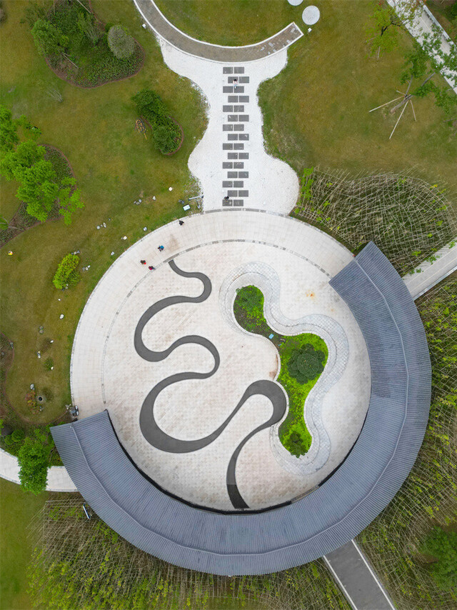 来到文博公园山顶,圆弧形风雨连廊形成一个圈,圈里是“海绵+文化”的巧妙融合而形成的标志性景点——曲水流觞。风雨连廊房顶斜坡的雨水,从屋檐滴落到碎石带上,经过消能、净化后,汇入蓄水池。