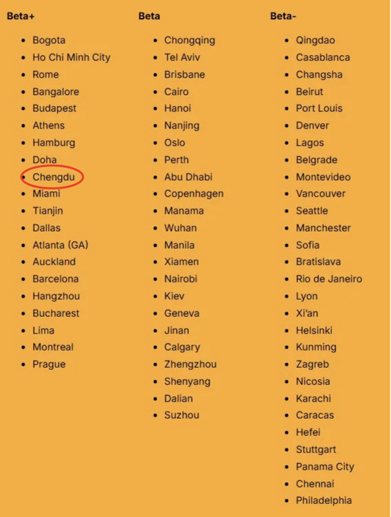 全球化与世界城市(GaWC)研究网络,自2000年以来不定期发布的《世界城市名册》,被誉为“全球关于世界一、二、三、四线城市最权威的排名”。在下半年发布的《2024世界城市名册》中,成都较上期排名提升13个位次,位列全球第58位。