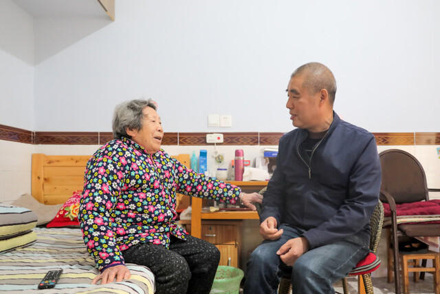 放下菜、沏好茶,张和平坐在院子里和老人们拉家常,大家打开了话匣子。