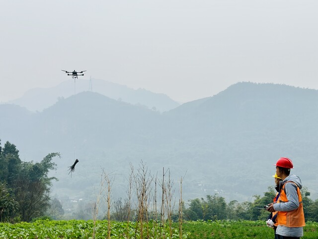 去年11月初,王飞带着专业团队来实地演示了竹子运输过程:伴随着操作者的指令,无人机起飞,一根长约10余米的绳子垂直地落在已经砍伐好的竹林里,村民熟练地将一捆100斤左右的竹子捆绑完成,无人机吊起竹子直线飞行300多米后,将竹子卸载在乡村公路旁一块平坦的地面上,前后用时5分钟左右。