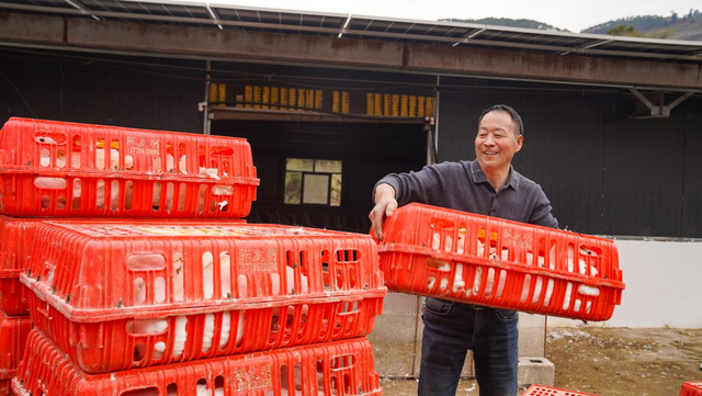 春节前最后一批售卖的大白鹅要在这两天装箱运走,国家能源集团派驻红军树村第一书记敬海波和村民们正在养殖场内忙碌。他们先将大白鹅全部引导进入棚内,随后动作娴熟地抓起一只只大白鹅,将它们放入早已准备好的箱子统一发车销售。