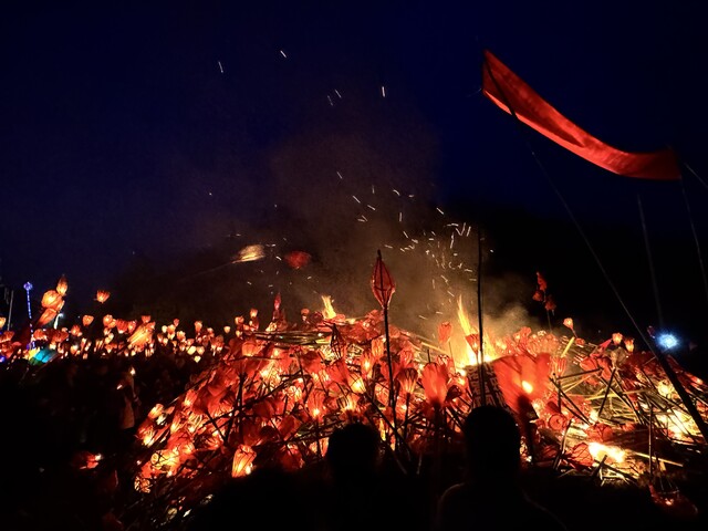 点点灯光有序汇聚,在乡村道路上蜿蜒穿梭。当队伍行至集中祈福点,大家按照传统习俗,将“大蛴蟆灯”焚烧,将“小蛴蟆灯”插入土中或投入河中。就在此时,震耳欲聋的鞭炮声再次响起,锣鼓声也敲得越发欢快,仿佛在为“蛴蟆”们送行,也合力奏响新年序曲。