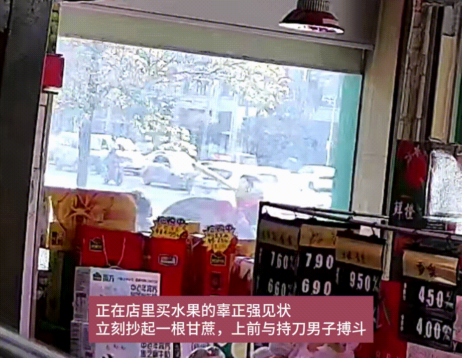 辜正强家住眉山市仁寿县龙马镇永红街,中共党员,今年47岁,是一名退役军人。今年2月25日上午10点29分,辜正强在仁寿县龙滩大道一水果店购买水果时,见两名过路男子在店外人行道发生冲突,对打斗殴。突然,其中一名男子转身冲进水果店抢走一把甘蔗刀(刀刃长18cm),水果店女店主上前阻止,该男子反身持刀向她挥舞乱砍,把她吓得摔倒在地。女店主丈夫护妻心切,挺身上前阻止,该男子转身拿起甘蔗刀就追杀女店主丈夫,女店主爬起来边跑边惊喊:“快点报警……”。