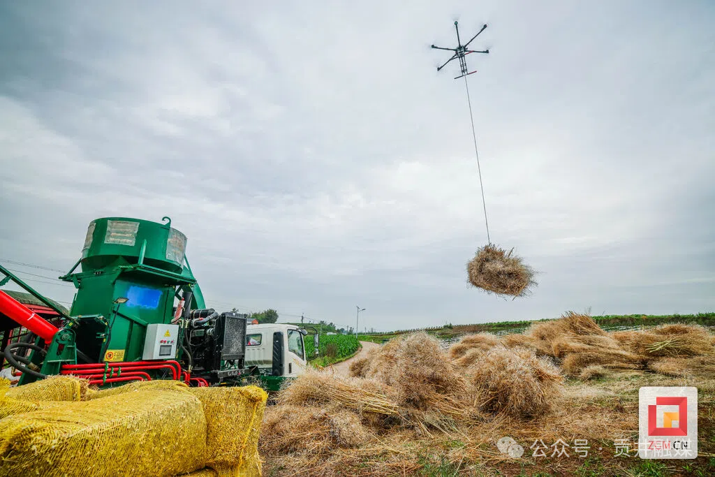 驱车行驶在蜿蜒起伏的公路上,到处可见弯腰躬背的村民,田野已奏响农忙序曲,阡陌纵横间,农户们正与时节赛跑。针对沿公路50米外农户自行集中堆积打捆的秸秆,道澄村与无人机服务企业合作,将其运送至就近的“秸秆周转暂存点”,实现“离田离地”高效化,有效解决“离田离地”人工成本高、效率低的难题。形成田间打捆→无人机转运至路边粉碎压缩机→畜禽养殖专业合作社→秸秆肥料化的闭环处理链,可实现同比降低转运成本68%。“全量收集储运”思路,让秸秆变“零散堆放”为“规范回收”。