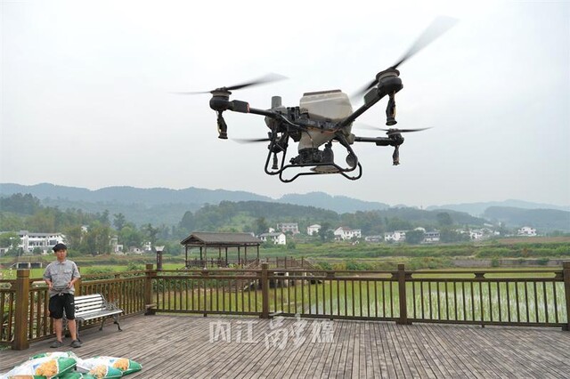 5月15日上午9点40分,隆昌市石燕桥镇三合村,“农业飞手”晏吕强娴熟地操控着遥控器,农用无人机在秧田上空划出规整航线,只见白色颗粒的复合肥沿着螺旋桨气流均匀沉降,洒向田间,为头天刚种上的秧苗提供养分。