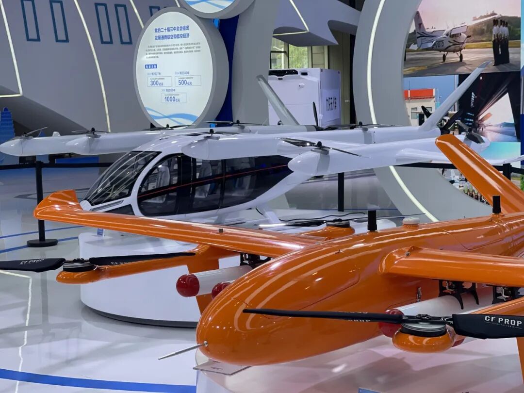 四川馆的这架飞行器还有一个“姐妹”。在3号馆的自贡馆内,一走进展馆,左手边便是低空经济展区,另一台沃兰特VE25-100模型与“天鹰Ⅱ号”无人机前后陈列,在他们周围,陈列着DF-50重载无人机、翼龙-2H、涵道风扇高空系留灭火无人机系统等众多展品,无一不是“自贡造”。